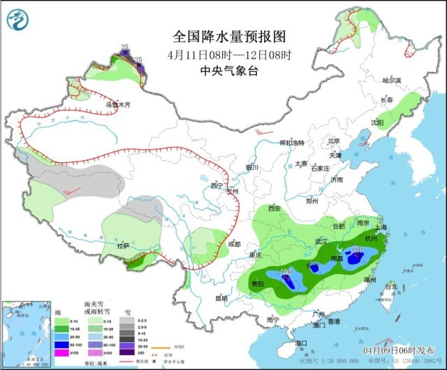 4月11日08時至12日08時,新疆北疆北部、內(nèi)蒙古東北部、黑龍江西北部、西藏西部和中北部、青海南部、川西高原等地部分地區(qū)有小到中雪或雨夾雪,其中,新疆北疆北部高海拔地區(qū)有大到暴雪,局地大暴雪(20~25毫米)。貴州東部、廣西北部、江南大部的部分地區(qū)有中到大雨,其中,湖南東部和西南部、廣西北部、江西東北部、浙江西南部、福建西北部等地部分地區(qū)有暴雨或大暴雨(100~120毫米)。內(nèi)蒙古西北部、西藏西部等地部分地區(qū)有4~5級風(fēng)。
