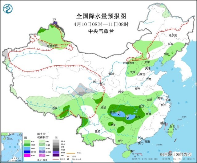 4月10日08時至11日08時,新疆北疆北部、黑龍江西北部、西藏中部和北部、青海東南部、川西高原北部等地部分地區(qū)有小到中雪或雨夾雪,其中,新疆北疆北部高海拔地區(qū)有大到暴雪,局地大暴雪(20~25毫米)。內(nèi)蒙古東部、華北北部、東北地區(qū)東部、新疆北部、西藏東部、四川盆地大部、重慶、江淮西部、江漢、江南北部和西部、貴州大部、廣西大部、云南西部和南部、海南島、臺灣島等地部分地區(qū)有小到中雨,其中,重慶東南部、貴州北部、湖南中西部等地部分地區(qū)有大雨(25~40毫米)。新疆東部部分地區(qū)有6~7級風(fēng)。