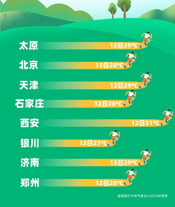 華北、黃淮、西北地區(qū)東部等地的氣溫沖勁也很猛,12日至13日氣溫將達(dá)到近期高點,山西、河南、河北等局地還可能有30℃的氣溫冒頭,暖熱程度堪比常年5、6月。