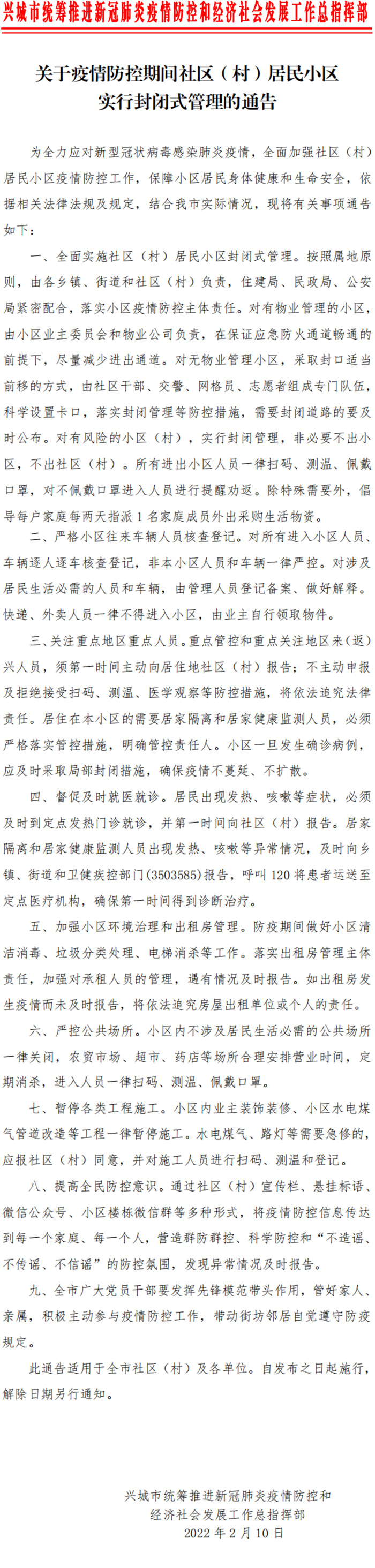 中新網(wǎng)2月11日電 據(jù)興城市政府網(wǎng)站消息,遼寧葫蘆島興城市統(tǒng)籌推進(jìn)新冠肺炎疫情防控和經(jīng)濟(jì)社會發(fā)展工作總指揮部10日發(fā)布通知,即日起,全面實(shí)施社區(qū)(村)居民小區(qū)封閉式管理,對有風(fēng)險的小區(qū)(村),實(shí)行封閉管理,非必要不出小區(qū),不出社區(qū)(村)。