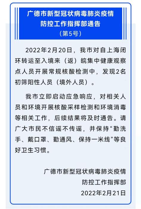 記者從安徽省廣德市新型冠狀病毒肺炎疫情防控工作指揮部獲悉,2月20日,廣德市對自上海閉環(huán)轉(zhuǎn)運(yùn)至入境來(返)皖集中健康觀察點人員開展常規(guī)核酸檢測中,發(fā)現(xiàn)2名初篩陽性人員(境外人員)。