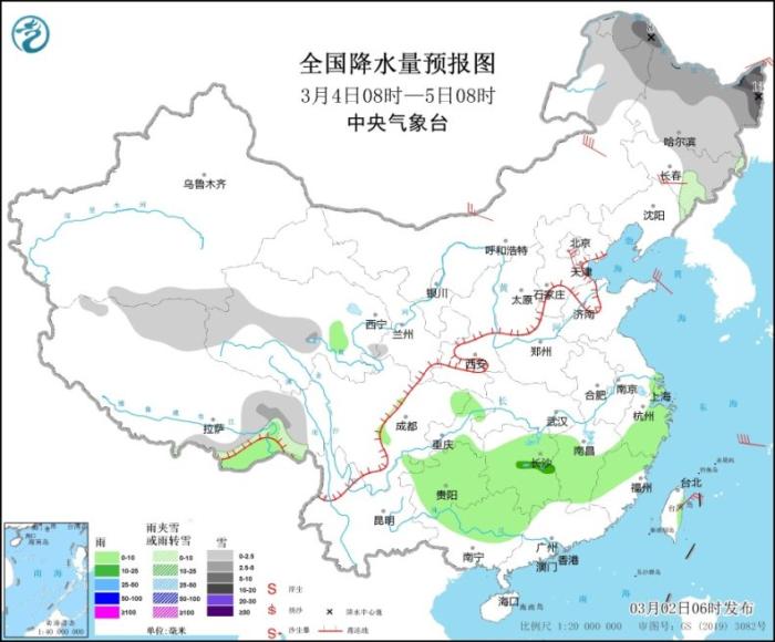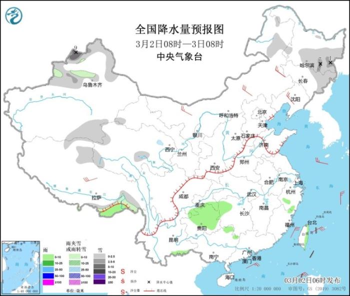 全國降水量預(yù)報(bào)圖(3月2日08時(shí)-3日08時(shí))