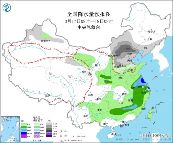 3月17日8時至18日8時,內(nèi)蒙古中部、東北地區(qū)南部、新疆北部、青海北部、華北大部等地部分地區(qū)有小到中雪或雨夾雪,其中,內(nèi)蒙古中部、河北北部等地部分地區(qū)有大到暴雪(10~11毫米)。陜西中部、江淮大部、江南中東部和南部、廣西東北部等地部分地區(qū)有中到大雨,其中,江蘇中部局地有暴雨。
