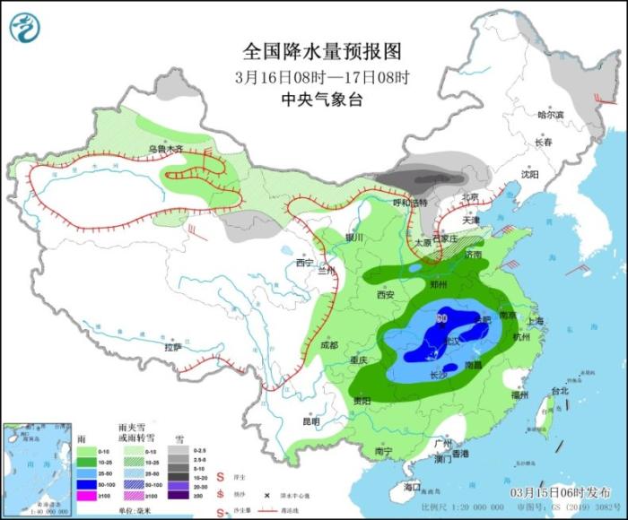3月16日8時至17日8時,新疆北部、內(nèi)蒙古中西部、黑龍江北部和東部、青海北部、甘肅河西、華北北部和西部等地部分地區(qū)有小到中雪或雨夾雪,其中,內(nèi)蒙古中部、河北北部等地局地有大到暴雪。陜西中部、黃淮大部、江淮大部、江漢、江南中西部和北部、重慶東部、貴州中東部等地部分地區(qū)有中到大雨,其中,河南南部、安徽中部、湖北北部和東部、湖南北部等地局地有暴雨(50~90毫米)。黑龍江東部、新疆東部、青海西部等地部分地區(qū)有4~6級風(fēng)。