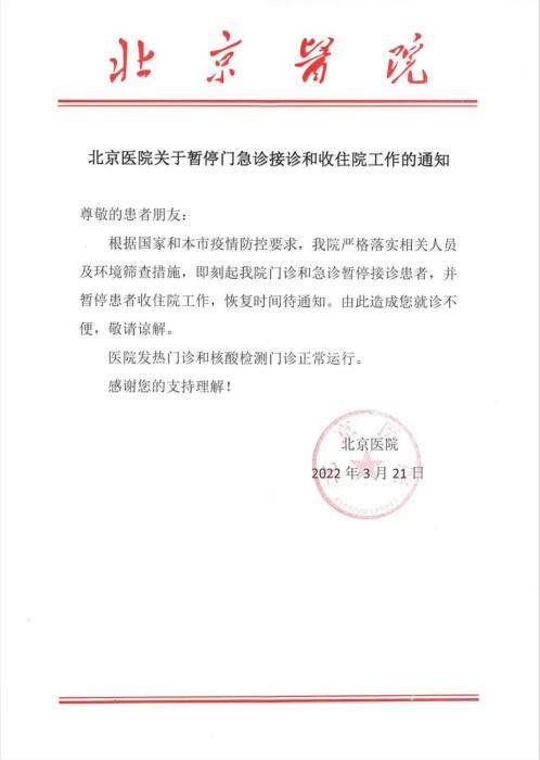 中新網(wǎng)3月21日電 據(jù)北京醫(yī)院微信公眾號21日消息,根據(jù)國家和北京市疫情防控要求,該醫(yī)院嚴(yán)格落實(shí)相關(guān)人員及環(huán)境篩查措施,即刻起該醫(yī)院門診和急診暫停接診患者,并暫?;颊呤兆≡汗ぷ?,恢復(fù)時(shí)間另行通知。發(fā)熱門診和核酸檢測門診正常運(yùn)行。通知如下:
