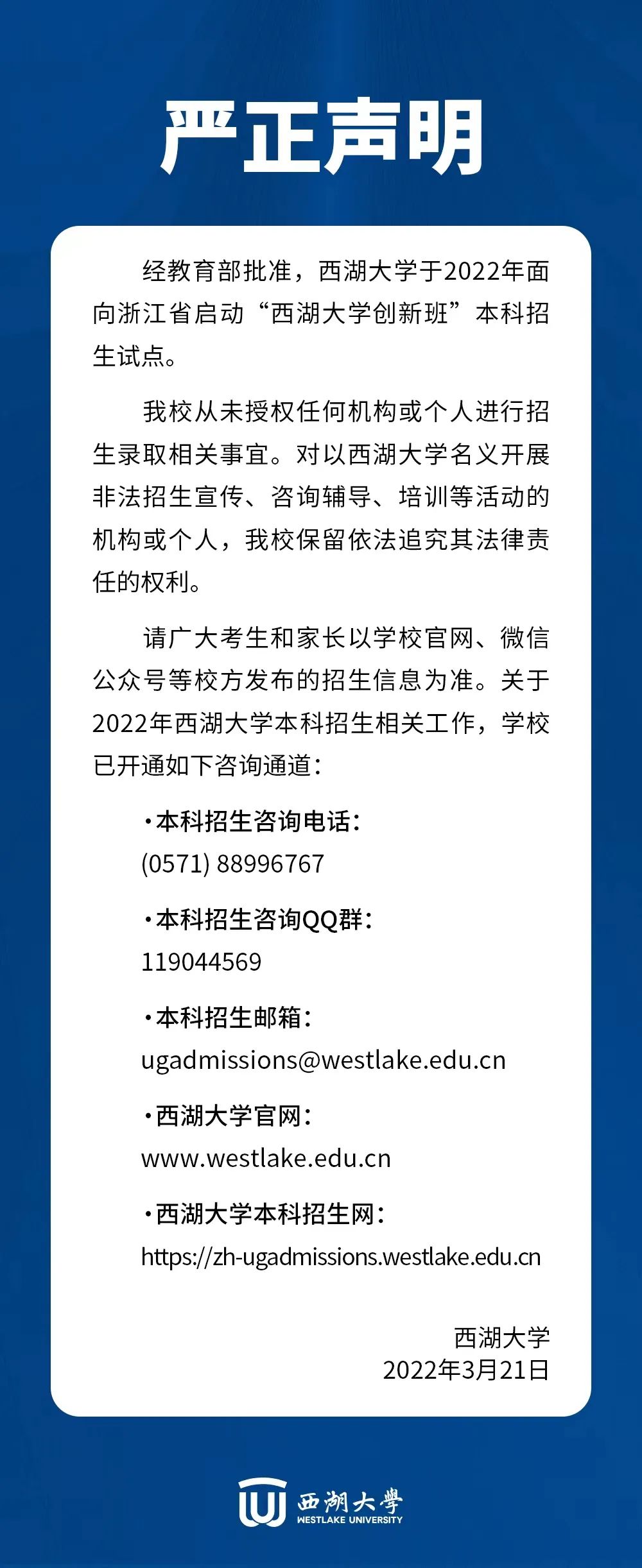 中新網(wǎng)3月21日電 據(jù)“西湖大學(xué)WestlakeUniversity”微信公眾號消息,3月21日,西湖大學(xué)發(fā)布《關(guān)于2022年西湖大學(xué)本科招生的嚴(yán)正聲明》,聲明指出,經(jīng)教育部批準(zhǔn),西湖大學(xué)于2022年面向浙江省啟動(dòng)“西湖大學(xué)創(chuàng)新班”本科招生試點(diǎn)。該校從未授權(quán)任何機(jī)構(gòu)或個(gè)人進(jìn)行招生錄取相關(guān)事宜。對以西湖大學(xué)名義開展非法招生宣傳、咨詢輔導(dǎo)、培訓(xùn)等活動(dòng)的機(jī)構(gòu)或個(gè)人,該校保留依法追究其法律責(zé)任的權(quán)利。