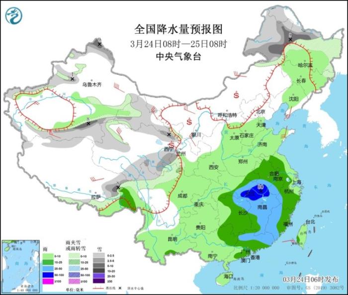 3月24日08時(shí)至25日08時(shí),內(nèi)蒙古東部、黑龍江北部和東部、新疆西北部和南部、西藏東北部、青海北部和東南部、甘肅河西和西南部等地的部分地區(qū)有小到中雪或雨夾雪,其中,內(nèi)蒙古東北部、黑龍江西部、新疆北疆北部和南疆盆地等地的部分地區(qū)有大雪(5~9毫米)。江淮大部、江漢東部、江南大部、華南中東部等地的部分地區(qū)有中到大雨,其中,安徽西南部、湖北東部、江西北部等地的部分地區(qū)暴雨(50~80毫米)。內(nèi)蒙古中西部、遼東半島、新疆南部、西藏北部、甘肅河西、寧夏中北部、山東半島等地的部分地區(qū)有4~6級(jí)風(fēng),其中,新疆東部、青海西北部等地的部分地區(qū)有6~7級(jí)風(fēng)(見(jiàn)圖2)。