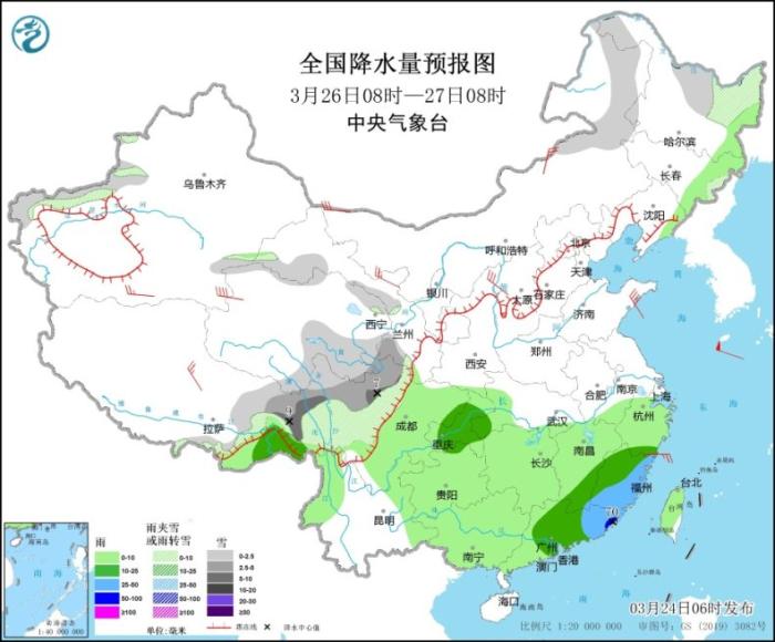 3月25日08時(shí)至26日08時(shí),內(nèi)蒙古東北部、黑龍江北部、新疆南疆盆地、西藏北部、青海中南部、甘肅西南部、川西高原北部等地的部分地區(qū)有小到中雪或雨夾雪,其中,內(nèi)蒙古東北部、黑龍江西北部、西藏東部等地的部分地區(qū)有大雪(5~9毫米)。吉林東南部、遼寧東部、山東中東部、江淮、江南大部、貴州東南部、華南北部等地的部分地區(qū)有中到大雨,其中,遼寧東部、江西北部、浙江西南部、福建西北部等地的部分地區(qū)暴雨(50~80毫米)。內(nèi)蒙古中西部、遼東半島、西藏北部、青海南部、陜西北部、山東半島、浙江北部等地的部分地區(qū)有4~6級(jí)風(fēng)(見(jiàn)圖3)。