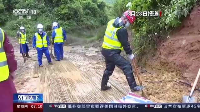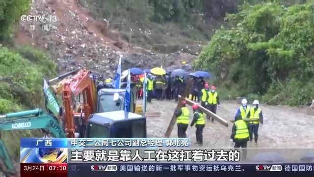 總臺(tái)央視記者 王世玉:我現(xiàn)在的位置是廣西梧州藤縣莫埌村的入口,也是通往事故核心區(qū)的一條必經(jīng)之路。大家看到在我身后的貨車正在進(jìn)行物資的裝卸,裝卸的物資是竹排。為什么要進(jìn)行竹排的運(yùn)輸呢?因?yàn)?現(xiàn)場(chǎng))從昨天晚上開始就一直在降雨,可以看到路面非常泥濘,在核心區(qū)內(nèi)通行更是非常困難。施工人員想到用竹排鋪滿在路面上,方便物資和人員的運(yùn)輸和通行。