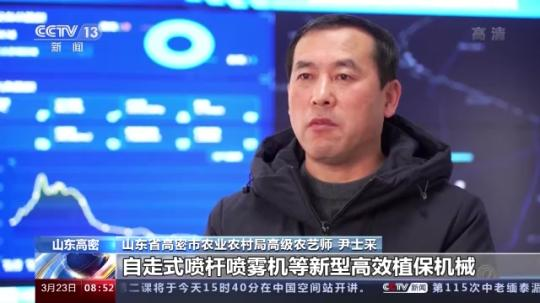 山東省高密市農(nóng)業(yè)農(nóng)村局高級(jí)農(nóng)藝師 尹士采:我們利用植保無人機(jī)、自走式噴桿噴霧機(jī)等新型高效植保機(jī)械,開展小麥病蟲草害統(tǒng)防統(tǒng)治,同時(shí)加強(qiáng)對(duì)農(nóng)戶、家庭農(nóng)場(chǎng)的指導(dǎo)服務(wù)。