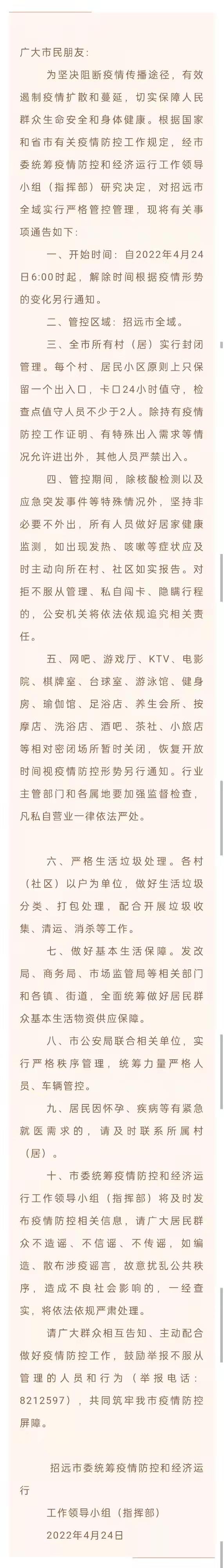 4月24日,山東煙臺招遠市委統(tǒng)籌疫情防控和經濟運行工作領導小組(指揮部)發(fā)布《關于全域實施嚴格管控管理的通告》。通告指出,自2022年4月24日6時起,招遠市所有村(居)實行封閉管理。每個村、居民小區(qū)原則上只保留一個出入口,卡口24小時值守,檢查點值守人員不少于2人。除持有疫情防控工作證明、有特殊出入需求等情況允許進出外,其他人員嚴禁出入。