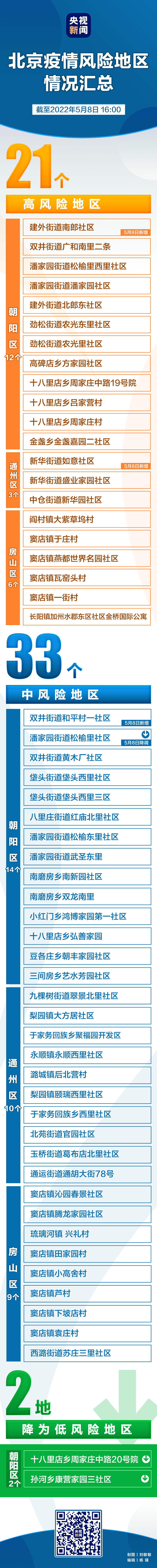 截至2022年5月7日24時(shí),朝陽(yáng)區(qū)十八里店鄉(xiāng)周家莊中路20號(hào)院、孫河鄉(xiāng)康營(yíng)家園三社區(qū)近14天各累計(jì)報(bào)告1例本土確診病例。經(jīng)北京市疾控中心評(píng)估,按照《北京市新冠肺炎疫情風(fēng)險(xiǎn)分級(jí)標(biāo)準(zhǔn)》,即日起將朝陽(yáng)區(qū)十八里店鄉(xiāng)周家莊中路20號(hào)院、孫河鄉(xiāng)康營(yíng)家園三社區(qū)由中風(fēng)險(xiǎn)地區(qū)降為低風(fēng)險(xiǎn)地區(qū)。