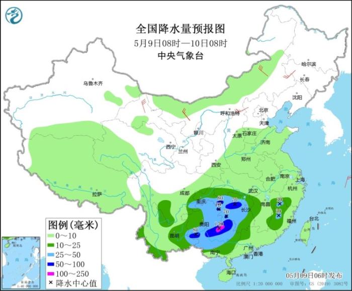 5月9日08時(shí)至10日08時(shí),西南地區(qū)東部和南部、江南西部、華南北部和西部等地部分地區(qū)有中到大雨,其中,湖南中西部、重慶東南部、貴州東南部、廣西北部等地部分地區(qū)有暴雨或大暴雨(100~140毫米)。甘肅河西、內(nèi)蒙古大部、東北地區(qū)等地部分地區(qū)有4~6級(jí)風(fēng)。