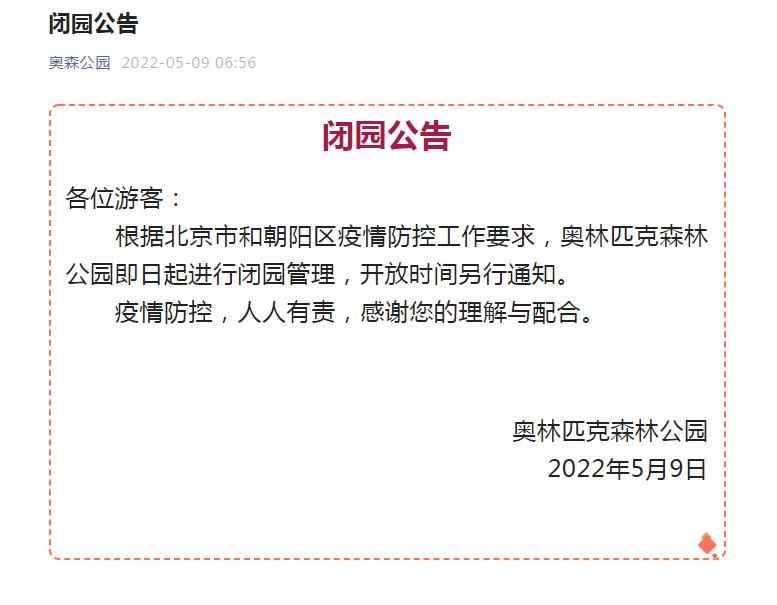 中新網(wǎng)5月9日電 “奧森公園”微信公眾號9日發(fā)布閉園公告,根據(jù)北京市和朝陽區(qū)疫情防控工作要求,奧林匹克森林公園即日起進(jìn)行閉園管理,開放時(shí)間另行通知。