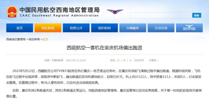 中新網5月12日電 據民航局網站消息,民航局今日就西藏航空一客機在重慶機場偏出跑道發(fā)布通報。通報稱,2022年5月12日,西藏航空公司TV9833航班在執(zhí)行重慶—林芝客運任務時,在重慶機場起飛滑跑過程中偏出跑道。根據機組反映,飛機在起飛過程中出現異常,按程序中斷起飛,偏出跑道后發(fā)動機擦地起火,目前已撲滅。機上共計122人,其中旅客113人,機組9人,已全部安全撤離。在撤離過程中,有36人擦傷扭傷,已及時送當地醫(yī)院檢查。