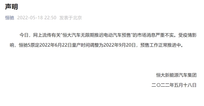 恒大回應(yīng)“無限期推遲電動汽車預(yù)售”:消息不實