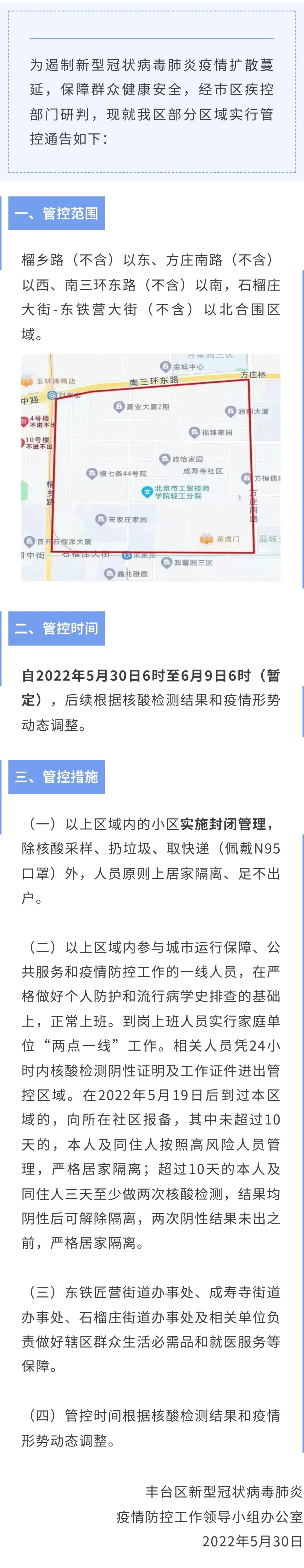 中新網(wǎng)5月30日電 據(jù)“北京豐臺”微信公眾號消息,30日,北京市豐臺區(qū)新型冠狀病毒肺炎疫情防控工作領(lǐng)導(dǎo)小組辦公室發(fā)布關(guān)于部分區(qū)域管控的通告。管控時間自2022年5月30日至6月9日6時,區(qū)域內(nèi)的小區(qū)實施封閉管理,人員原則上居家隔離、足不出戶。