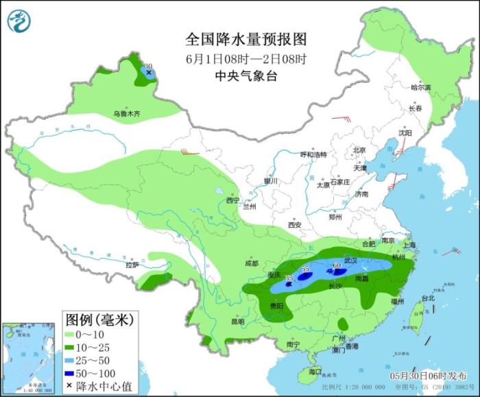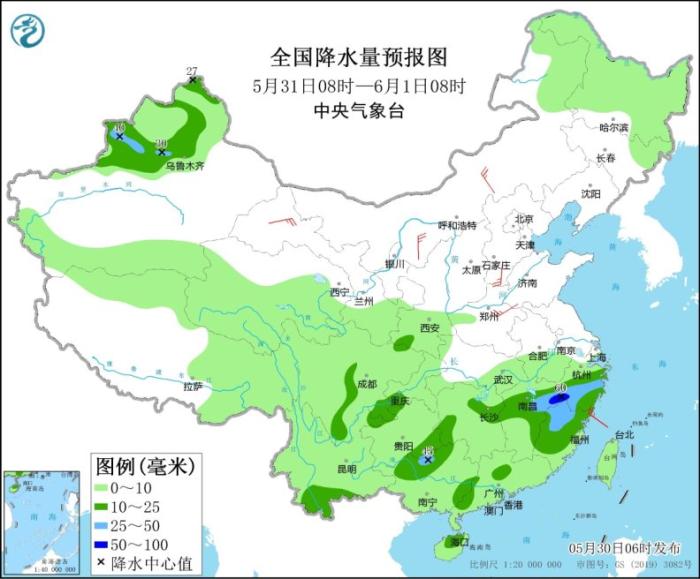 全國降水量預(yù)報(bào)圖(5月31日08時(shí)-6月1日08時(shí))