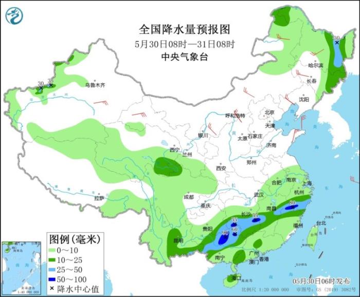 全國降水量預(yù)報(bào)圖(5月30日08時(shí)-31日08時(shí))