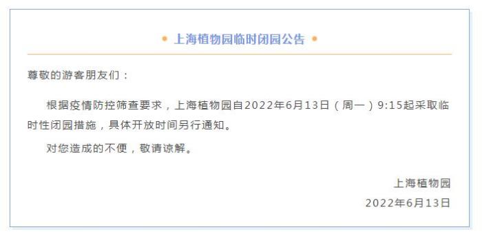 中新財經(jīng)6月13日電 上海植物園6月13日在微信公眾號發(fā)布公告稱,根據(jù)疫情防控篩查要求,上海植物園自2022年6月13日(周一)9:15起采取臨時性閉園措施,具體開放時間另行通知。(完)