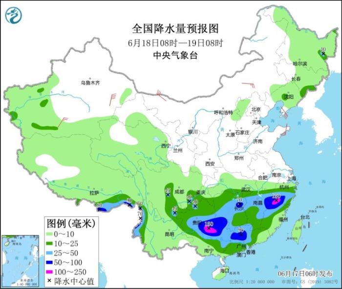 全國降水量預(yù)報圖(6月17日08時-18日08時)