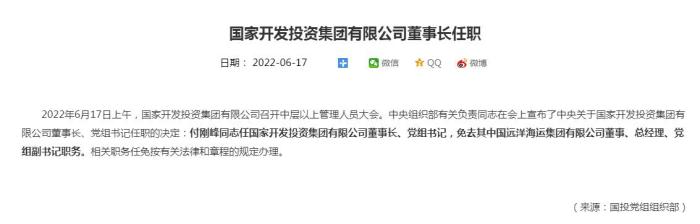 中新財(cái)經(jīng)6月17日電 國家開發(fā)投資集團(tuán)有限公司網(wǎng)站6月17日消息,2022年6月17日上午,國家開發(fā)投資集團(tuán)有限公司召開中層以上管理人員大會(huì)。中央組織部有關(guān)負(fù)責(zé)同志在會(huì)上宣布了中央關(guān)于國家開發(fā)投資集團(tuán)有限公司董事長、黨組書記任職的決定:付剛峰同志任國家開發(fā)投資集團(tuán)有限公司董事長、黨組書記,免去其中國遠(yuǎn)洋海運(yùn)集團(tuán)有限公司董事、總經(jīng)理、黨組副書記職務(wù)。相關(guān)職務(wù)任免按有關(guān)法律和章程的規(guī)定辦理。(完)