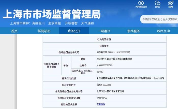 中新財經(jīng)6月20日電 上海市市場監(jiān)督管理局網(wǎng)站消息,近日,沃爾瑪華東百貨有限公司上海顧村分店,因售賣過期悅鮮活牛奶,被上海市寶山區(qū)市場監(jiān)督管理局罰款3萬元。