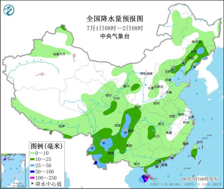 圖2全國降水量預報圖(6月29日08時-30日08時)