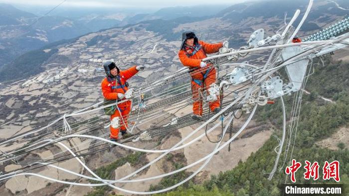 電力工人曾坤銀和熊志偉正在進行高空作業(yè)。 盧忠東 攝
