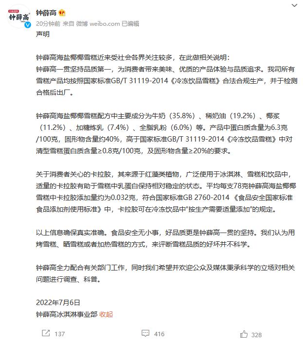 鐘薛高發(fā)布聲明:卡拉膠添加量符合國(guó)家標(biāo)準(zhǔn)