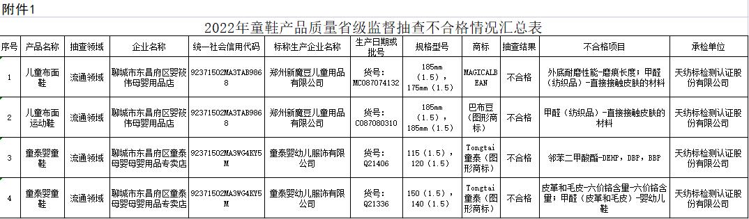 不合格產(chǎn)品涉及:鄭州新魔豆兒童用品有限公司生產(chǎn)的“MAGICALBEAN”牌兒童布面鞋、鄭州新魔豆兒童用品有限公司生產(chǎn)的“巴布豆”牌兒童布面運(yùn)動(dòng)鞋、2批次童泰嬰幼兒服飾有限公司生產(chǎn)的“Tongtai童泰”牌童泰嬰童鞋。