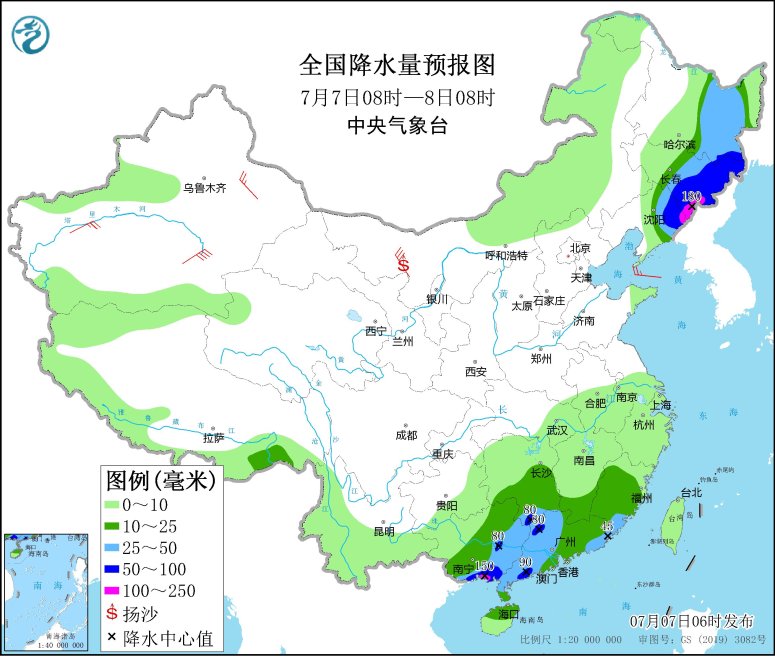 7月7日08時(shí)至8日08時(shí),遼寧東部、吉林中東部、黑龍江東部、廣西中東部、廣東西部和東南部等地有大到暴雨,其中,吉林東南部、廣西東南部等地的部分地區(qū)有大暴雨(100~180毫米)。內(nèi)蒙古西北部、新疆東部和南疆盆地等地部分地區(qū)有5~7級風(fēng)。黃海北部海域?qū)⒂?~8級、陣風(fēng)9級的偏南風(fēng)轉(zhuǎn)5~6級、陣風(fēng)7級的偏西風(fēng),渤海將有4~6級、陣風(fēng)7級的偏北風(fēng)轉(zhuǎn)西南風(fēng)。