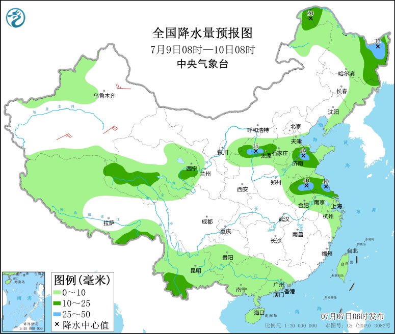 7月9日08時(shí)至10日08時(shí),內(nèi)蒙古東北部、東北地區(qū)東部、西北地區(qū)中部、華北中西部和南部、黃淮大部、江淮大部、華南大部、臺灣島等地有小到中雨,其中,黑龍江東北部、山西中部、山東中部、蘇皖北部等地部分地區(qū)有大雨(25~45毫米)。新疆沿天山地區(qū)和南疆盆地等地部分地區(qū)有4~6級風(fēng)。南海南部海域?qū)⒂?~6級、陣風(fēng)7級的偏西到西南風(fēng)。
