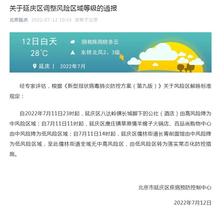 中新網(wǎng)7月12日電 據(jù)“北京延慶”微信公眾號(hào)消息,北京市延慶區(qū)疾病預(yù)防控制中心12日發(fā)布通報(bào)稱(chēng),經(jīng)專(zhuān)家評(píng)估,根據(jù)《新型冠狀病毒肺炎防控方案(第九版)》關(guān)于風(fēng)險(xiǎn)區(qū)解除標(biāo)準(zhǔn)規(guī)定:自2022年7月11日23時(shí)起,延慶區(qū)八達(dá)嶺鎮(zhèn)長(zhǎng)城腳下的公社(酒店)由高風(fēng)險(xiǎn)降為中風(fēng)險(xiǎn)區(qū)域;自7月11日11時(shí)起,延慶區(qū)康莊鎮(zhèn)草原情羊蝎子火鍋店、百品尚購(gòu)物中心由中風(fēng)險(xiǎn)降為低風(fēng)險(xiǎn)區(qū)域;自7月11日14時(shí)起,延慶區(qū)儒林街道長(zhǎng)青削面館由中風(fēng)險(xiǎn)降為低風(fēng)險(xiǎn)區(qū)域,至此儒林街道全域無(wú)中高風(fēng)險(xiǎn)區(qū),由低風(fēng)險(xiǎn)區(qū)轉(zhuǎn)為落實(shí)常態(tài)化防控措施。