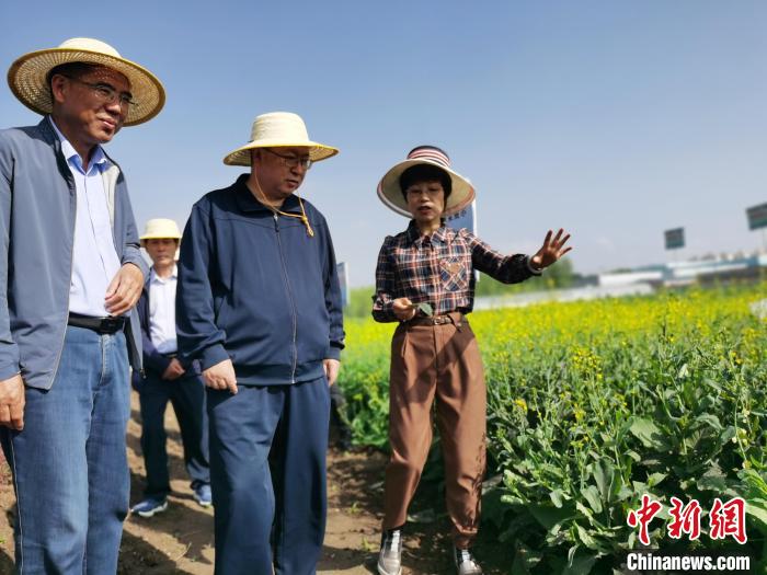 圖為青海省政協(xié)主席公保扎西(中)調(diào)研油菜種植?!?zhí)砀?攝