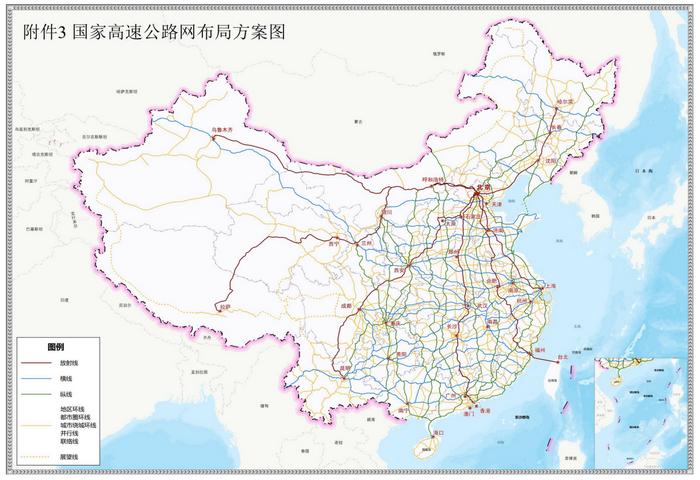國家高速公路網(wǎng)由7條首都放射線、11條北南縱線、18條東西橫線,以及6條地區(qū)環(huán)線、12條都市圈環(huán)線、30條城市繞城環(huán)線、31條并行線、163條聯(lián)絡線組成。其中,首都放射線包括:北京—哈爾濱、北京—上海、北京—臺北、北京—港澳、北京—昆明、北京—拉薩、北京—烏魯木齊。(中新財經(jīng))