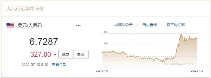中新網(wǎng)7月12日電 中國人民銀行授權(quán)中國外匯交易中心公布,7月12日,銀行間外匯市場人民幣對美元匯率中間價(jià)報(bào)6.7287元,調(diào)貶327個(gè)基點(diǎn)。(中新財(cái)經(jīng))