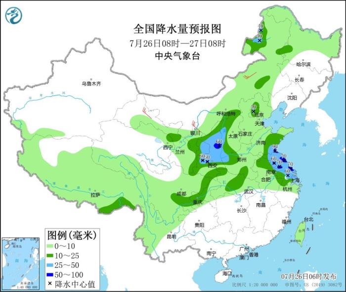 圖2 全國降水量預(yù)報圖(7月26日08時-27日08時)