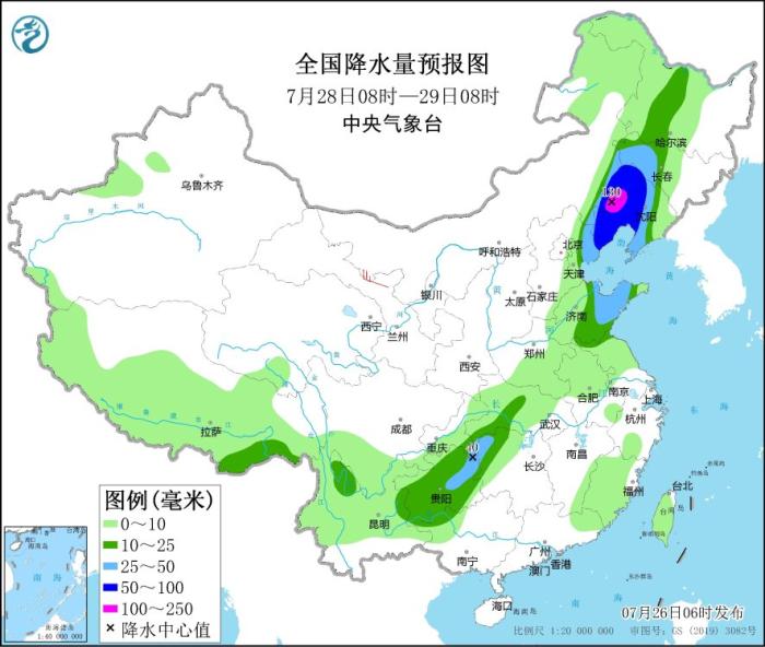 圖4 全國降水量預(yù)報圖(7月28日08時-29日08時)