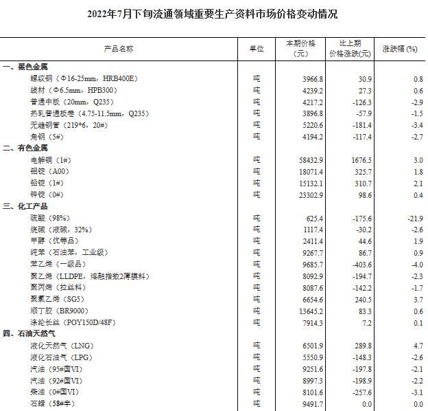 中新網8月4日電 國家統(tǒng)計局4日公布2022年7月下旬流通領域重要生產資料市場價格變動情況,據(jù)對全國流通領域9大類50種重要生產資料市場價格的監(jiān)測顯示,2022年7月下旬與7月中旬相比,15種產品價格上漲,32種下降,3種持平。
