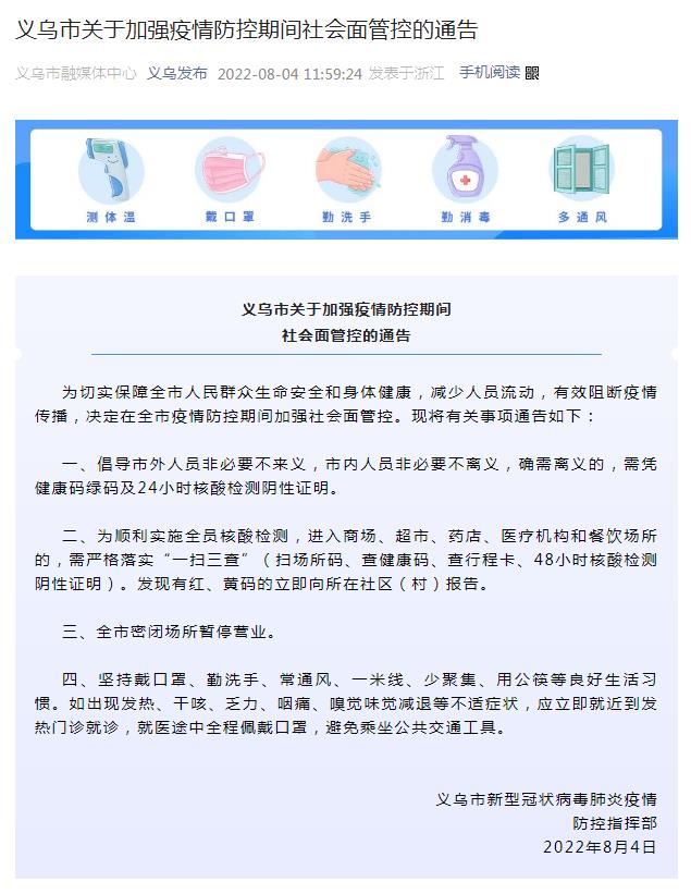 中新網(wǎng)8月4日電 據(jù)“義烏發(fā)布”微信公眾號(hào)消息,浙江省義烏市新型冠狀病毒肺炎疫情防控指揮部4日發(fā)布義烏市關(guān)于加強(qiáng)疫情防控期間社會(huì)面管控的通告。通告指出,為切實(shí)保障全市人民群眾生命安全和身體健康,減少人員流動(dòng),有效阻斷疫情傳播,決定在全市疫情防控期間加強(qiáng)社會(huì)面管控。