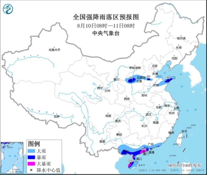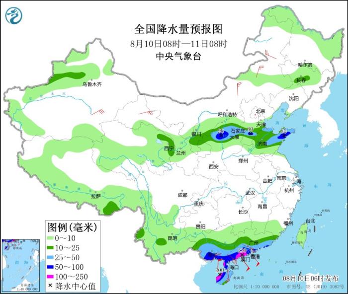 8月10日08時(shí)至11日08時(shí),新疆伊犁河谷和沿天山附近、青海東部、寧夏中部、陜西北部、山西中北部、河北南部、山東大部及廣東中南部、海南島、廣西中南部等地有中到大雨,其中,陜西北部、山西中部、河北南部、山東半島西部、廣東南部、海南島西部、廣西南部等地的部分地區(qū)有暴雨或大暴雨(100~220毫米)。甘肅西部、內(nèi)蒙古東部、廣東南部、廣西南部、海南島等地部分地區(qū)有4~6級(jí)風(fēng),沿海地區(qū)陣風(fēng)可達(dá)7~8級(jí)。