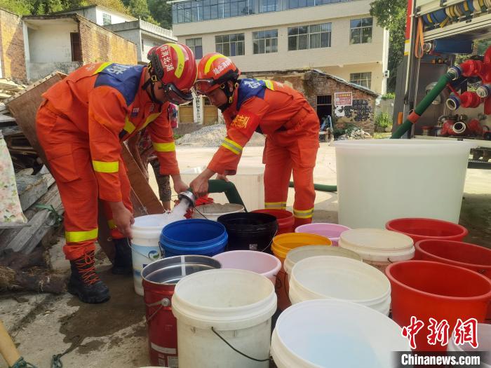 因持續(xù)干旱天氣,湖北咸寧不少地區(qū)民眾生活用水告急,消防員奔赴鄉(xiāng)村送水(資料圖) 湖北咸寧消防供圖
