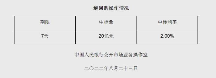 中新網(wǎng)8月23日電 據(jù)央行網(wǎng)站23日消息,為維護銀行體系流動性合理充裕,2022年8月23日人民銀行以利率招標方式開展了20億元逆回購操作,中標利率為2.00%。(中新財經(jīng))