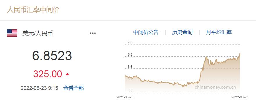8月23日人民幣對(duì)美元中間價(jià)報(bào)6.8523 下調(diào)325個(gè)基點(diǎn)