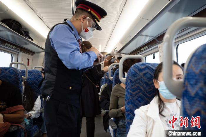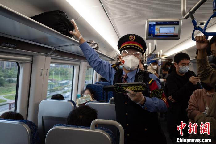 “請保管好自身財物,看管好小孩,照顧好老人,上下車注意腳下安全。”數(shù)百名乘客陸續(xù)上車后,鐘靜開始在車廂里巡視。疫情防控期間,他要提醒大家戴好口罩。遇到行李架上行李擺放不規(guī)范,他要動手整理。同時,他還負責整列4節(jié)車廂的查票、補票工作。