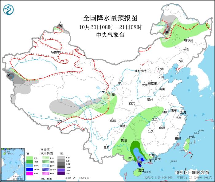 10月20日08時(shí)至21日08時(shí),內(nèi)蒙古東北部、新疆北疆北部和南疆盆地、西藏東北部、青海南部等地部分地區(qū)有小到中雪,其中,內(nèi)蒙古東北部、新疆北疆北部和南疆西部山區(qū)等地部分地區(qū)有大雪(5~8毫米)。廣西東部、廣東西南部等地部分地區(qū)有中到大雨,其中,廣東西南部等地部分地區(qū)有暴雨(50~90毫米)。遼東半島、廣西東南部沿海等地部分地區(qū)有4~6級(jí)風(fēng),其中,新疆東部部分地區(qū)有6~7級(jí)風(fēng)。