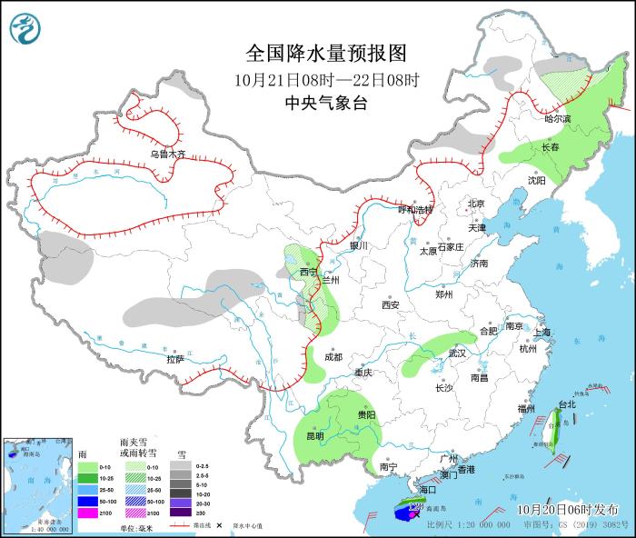 10月20日08時(shí)至21日08時(shí),內(nèi)蒙古東北部、新疆北疆北部和南疆西南部、西藏北部、青海東部和南部等地部分地區(qū)有小到中雪或雨夾雪,其中,新疆北疆北部等地部分地區(qū)有大到暴雪。廣西西部和南部、廣東西南部、海南島等地部分地區(qū)有中到大雨,其中,廣西南部沿海、海南島中東部等地部分地區(qū)有暴雨或大暴雨(100~150毫米)。