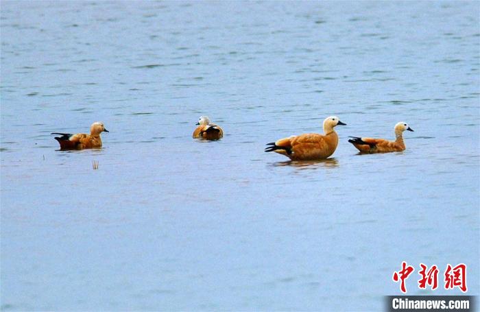 中新網(wǎng)蘭州10月31日電 (記者 馮志軍)“金秋天漸涼,又遇候鳥(niǎo)南飛時(shí)?!苯谝詠?lái),甘肅酒泉市敦煌鳴沙山下黨河濕地內(nèi),首次出現(xiàn)時(shí)而嬉戲,時(shí)而盤(pán)旋起舞的50余只國(guó)家二級(jí)保護(hù)動(dòng)物野生黃鴨,它們悠閑游弋、覓食。作為候鳥(niǎo)遷徙線(xiàn)上不可或缺的“休息站”,這是酒泉市眾多大漠濕地近年“變身”鳥(niǎo)類(lèi)樂(lè)園的一個(gè)縮影。