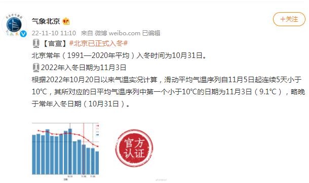 中新網(wǎng)11月10日電 據(jù)北京市氣象局官方微博消息,北京常年(1991—2020年平均)入冬時間為10月31日,2022年入冬日期為11月3日。